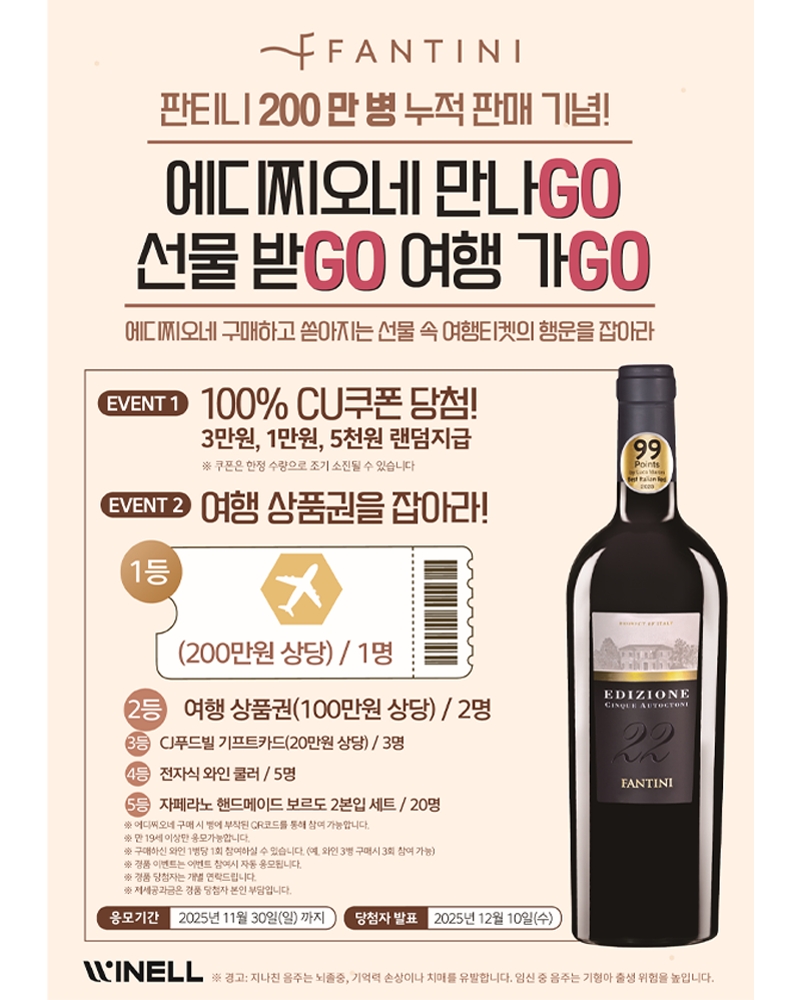 프리미엄 와인 수입사 ㈜와이넬은 대표 브랜드 판티니(Fantini)의 국내 누적 판매량 200만 병 돌파를 기념하여, 오는 9월 15일부터 11월 30일까지 ‘에디찌오네 만나GO 선물 받GO 여행 가GO’ 이벤트를 진행한다.