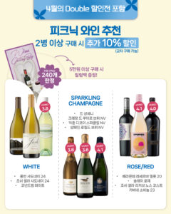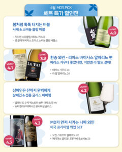 프로모션 기간 : 2026-04-01 ~ 2026-04-30무르익은 봄 기운, 와인잔 위에 피어날 4월 와인픽스 P!CK!혜택 : MD’s Pick 세트 특가 할인전, 행사 카테고리 내 와인 2병 이상 구매 시 추가 10% 할인 등 구매처 : 와인픽스 전 지점 참고 와인픽스 블로그 previous놓치면 아쉬울 단 14일간의 특별한 기회, 보틀벙커 블랙벙커데이 next따스한 4월을 맞아 찾아온 와인앤모어 ‘월간 와모’ 목록보기