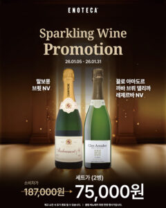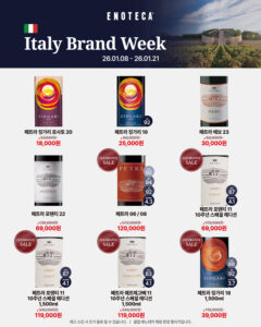 프로모션 기간 : 2026-01-01 ~ 2026-01-31새해의 시작을 더 특별하게! 에노테카 신년 기념 세일혜택 : 이탈리아 브랜드 위크 한정 혜택가, 카바 2종 신규 출시 프로모션, 뉴질랜드 그랑 크뤼 클라쎄 SET 특별가 등구매처 : 에노테카 직영샵 참고 에노테카 인스타그램 previous세븐일레븐 주류 브랜드 투표소 오픈! 인기 주류 20% 할인전 next2026년 새해 첫 잔을 위한 1월 와인픽스 P!CK! 목록보기