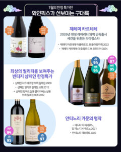 프로모션 기간 : 2026-01-01 ~ 2026-01-312026년 새해 첫 잔을 위한 1월 와인픽스 P!CK!혜택 : MD'S PICK 가격대별 세트 특가전, 구대륙vs신대륙 한정수량 특가전, 몬테스 카테고리 더블 할인전구매처 : 와인픽스 전 매장 참고 와인픽스 인스타그램 previous새해의 시작을 더 특별하게! 에노테카 신년 기념 세일 next와인앤모어 MD가 직접 고른 1월 새해 추천 와인 목록보기